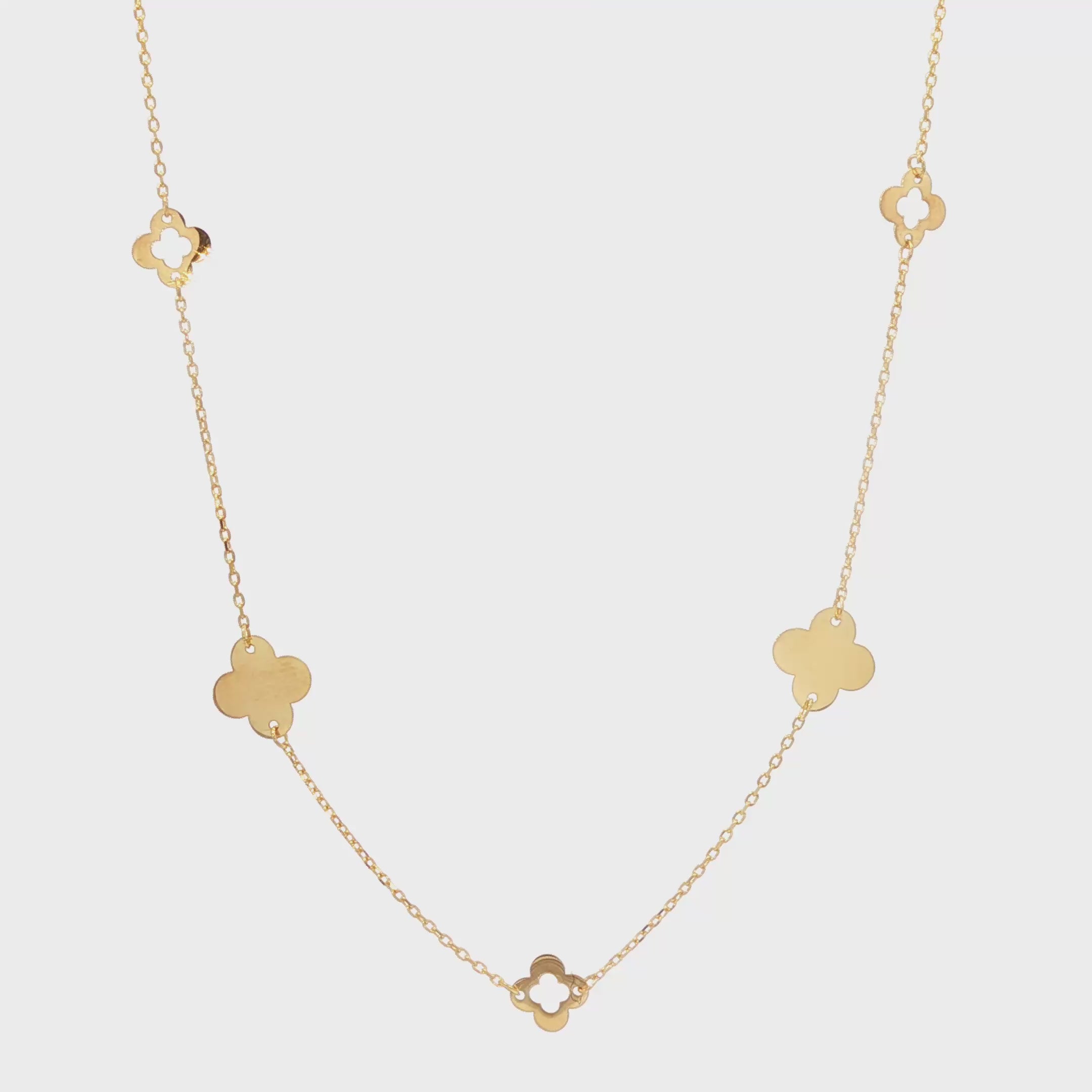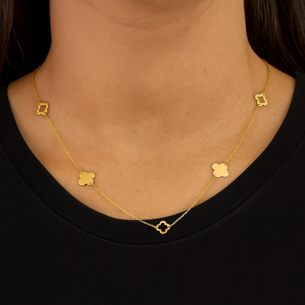 Elevate your jewelry collection with the Golden Clover Necklace, crafted in radiant 22K solid gold. Featuring delicate clover motifs evenly spaced along a fine chain, this necklace symbolizes luck, elegance, and timeless beauty. Its minimal yet luxurious design makes it perfect for layering or wearing solo.