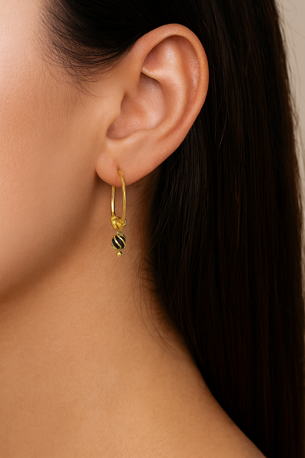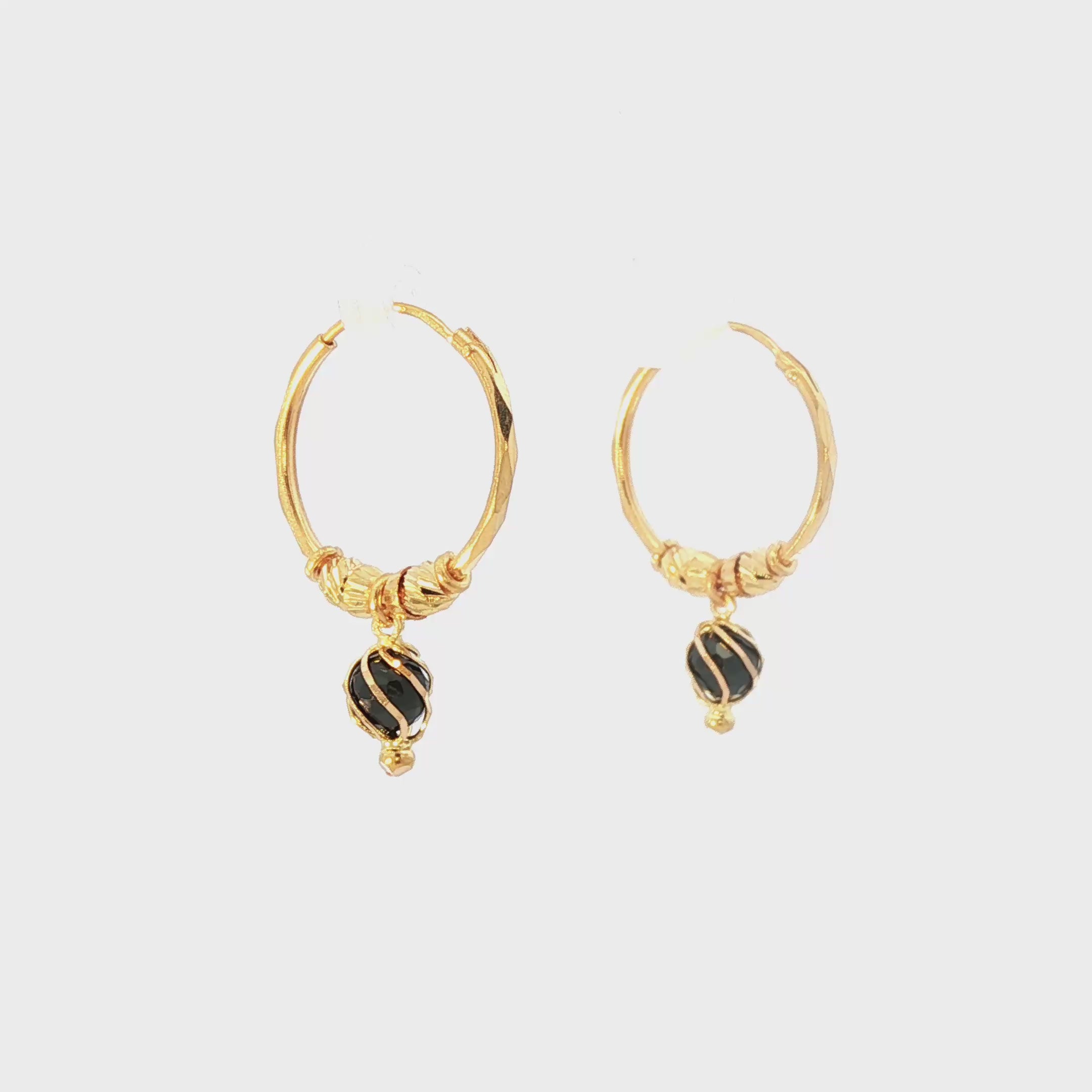 Enhance your jewelry collection with these dainty yellow gold hoop earrings. Each earring features a smooth, round cabochon onyx gemstone suspended delicately from the base of the hoop. The sleek, sophisticated design makes these earrings perfect for both everyday wear and special occasions, adding a touch of refined elegance to any ensemble.
