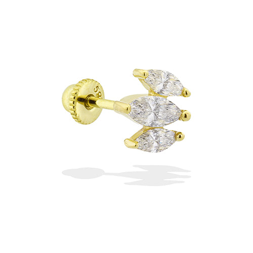 Refined and radiant, the Marquise Trio Piercing is crafted in 18K solid gold and features three brilliant marquise-cut cubic zirconia stones arranged in a vertical cascade. Its sleek and modern design makes it perfect for elevating helix, cartilage, or lobe piercings with effortless elegance. Lightweight yet striking, this piercing is the ideal blend of everyday wearability and luxurious shine.