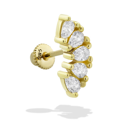 The Aurora Arc Piercing is a bold yet refined piece designed to bring brilliance to your ear stack. Crafted from 18K solid gold, this arc-shaped design features five pear-cut cubic zirconia, each meticulously set to capture and reflect light with every movement. Its curved silhouette hugs the ear beautifully, offering a sophisticated sparkle that’s both modern and timeless.